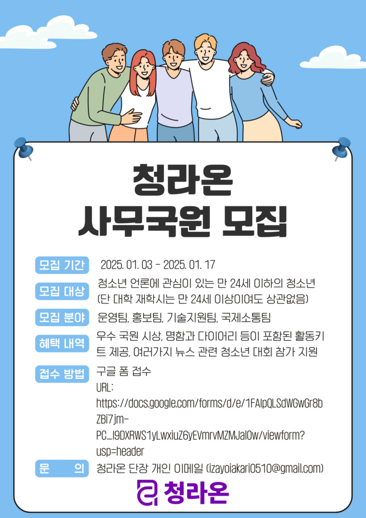 [수완뉴스=김동주 기자] 청소년단체 “유니엄” 산하 언론 청소년언론 ‘청라온'(단장: 안창민)이 사무국원을 1월 3일 모집한다고 밝혔다. 이번 사무국원 모집은 청소년의 목소리를 사회에 알리는 청소년 언론 청라온과 함께 성장할 청소년을 모집한다.