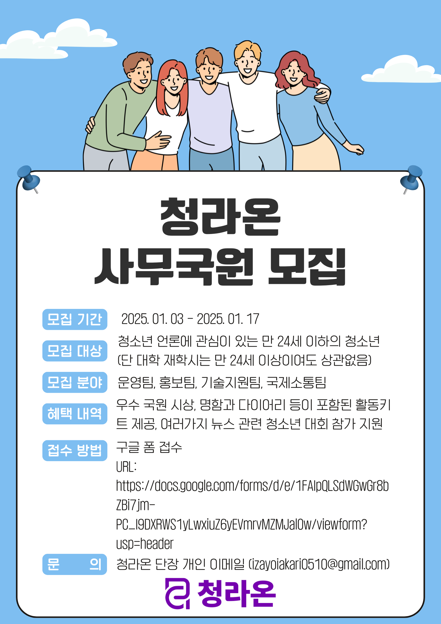 이번 청라온 사무국원 모집에 관해 궁금한 점은 청라온 공식 이메일([email protected])이나, 청라온 단장 개인 이메일로 하면 된다.